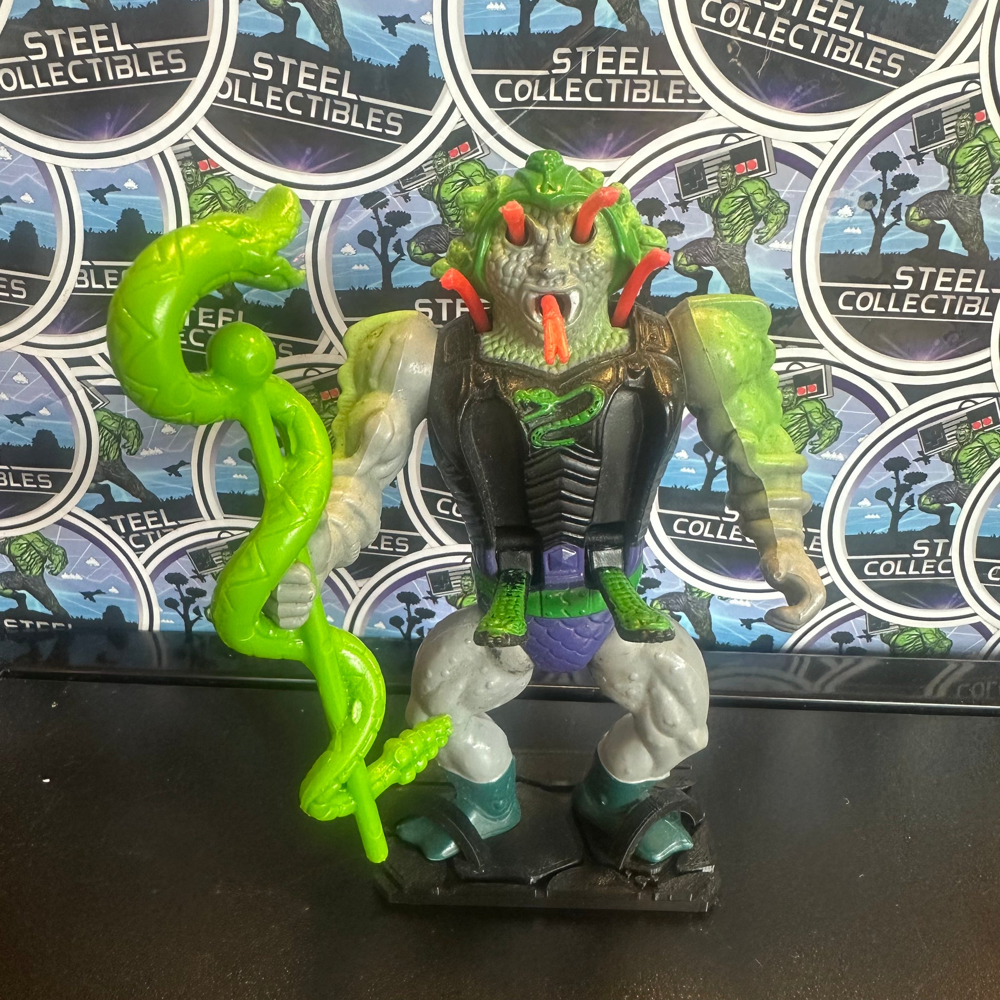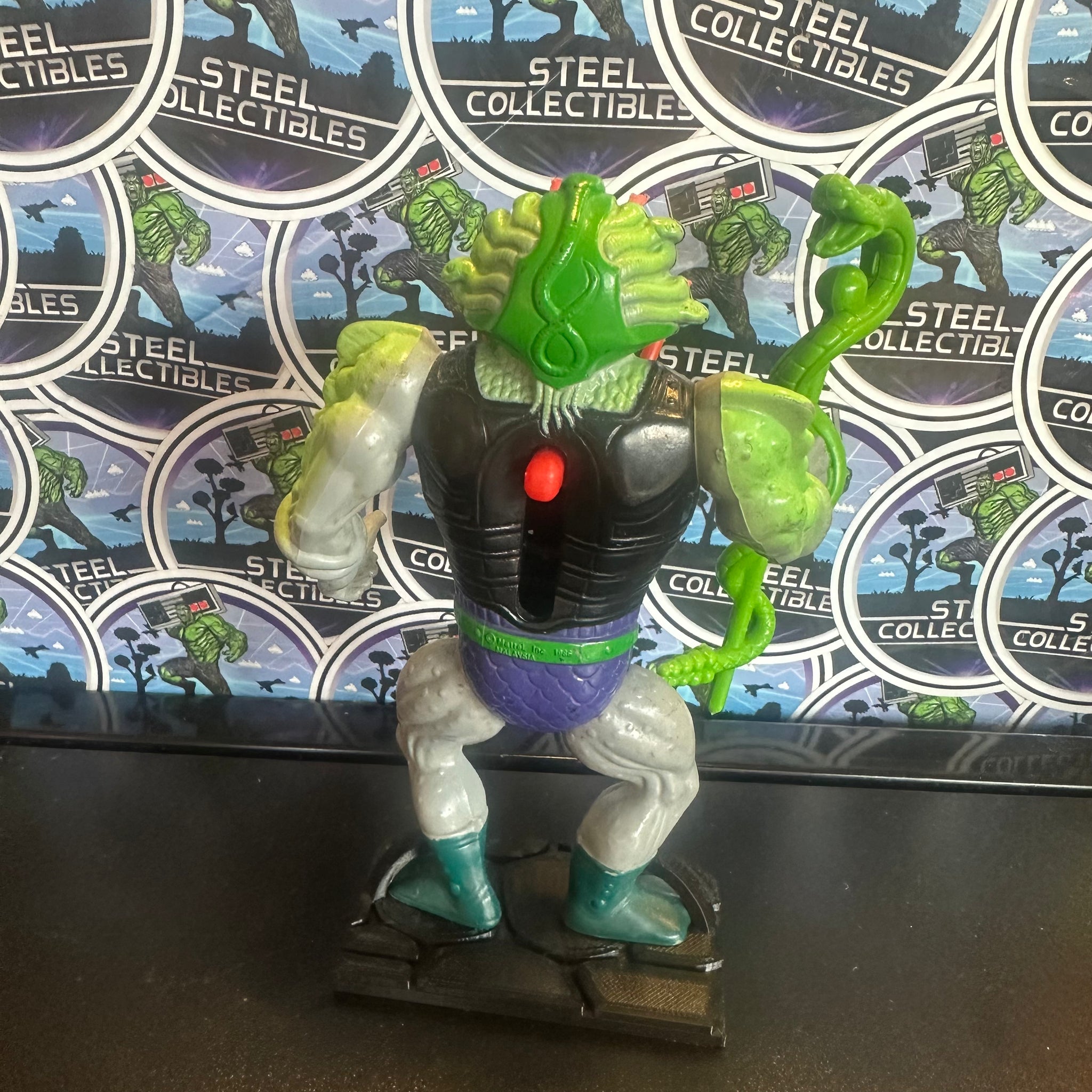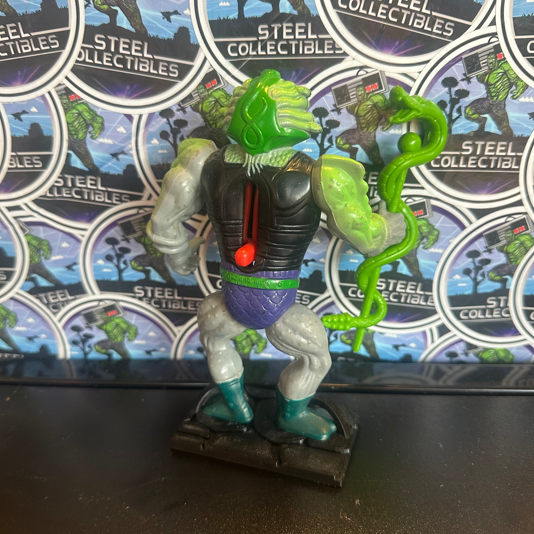 Mattel- Vintage 1986 MOTU “He-Man: Masters of the Universe” Snake Face w/ Snake Staff 6” Poseable Action Figure (w/ Custom 3D-Printed Base Stand)